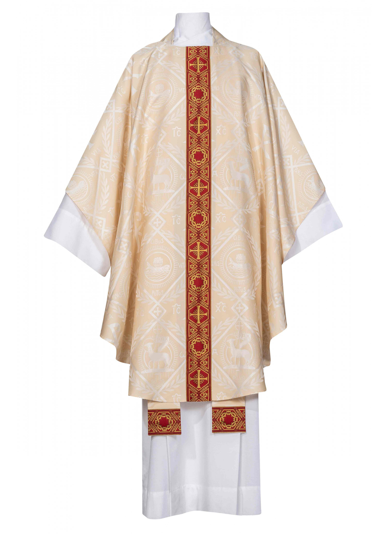 Diese Kollektion ist in Chi-Rho Damast mit Galone angefertigt.