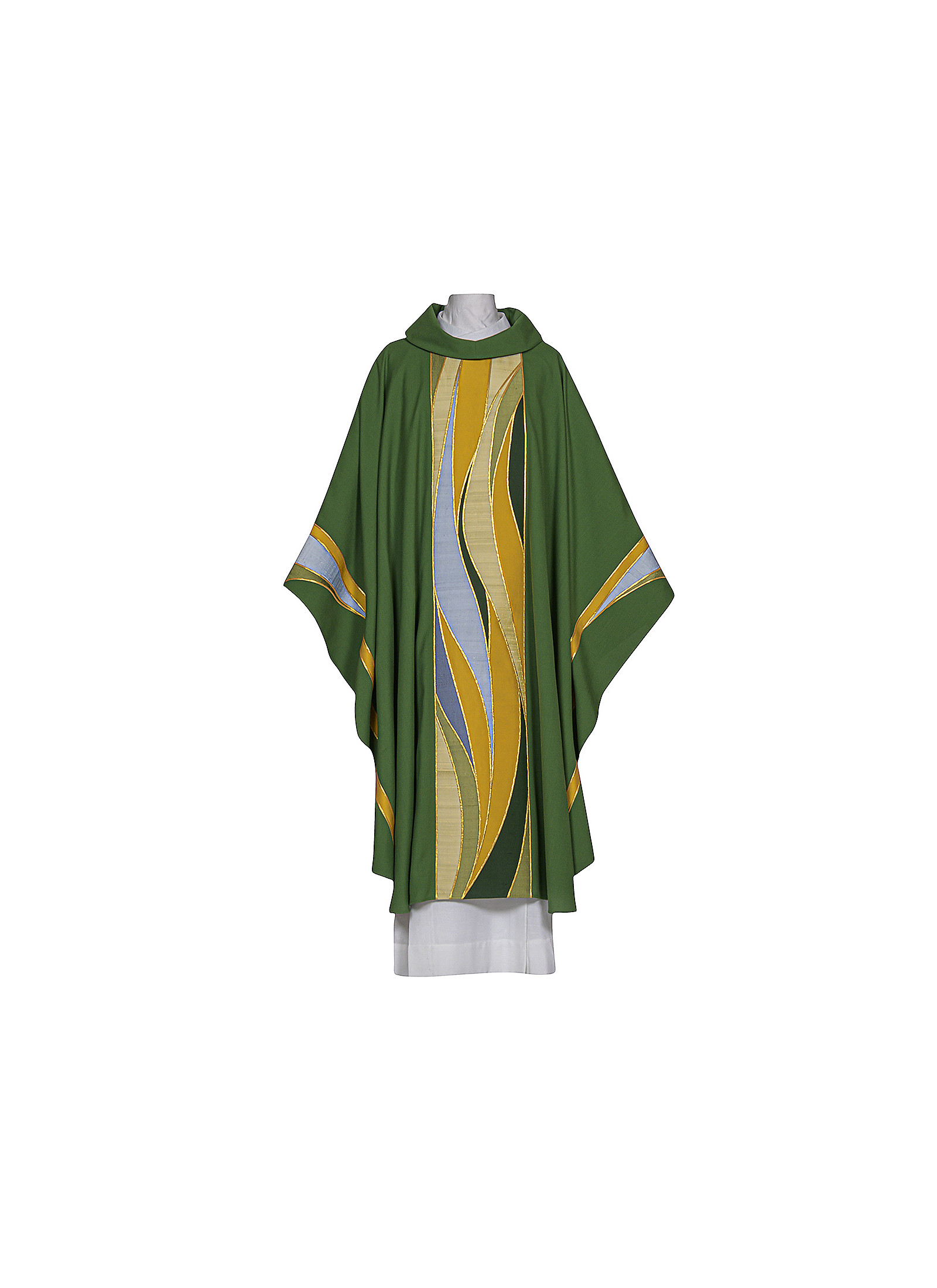 Kasel aus hochwertigem Wollmischgewebe Benedictus (45% Wolle, 55% Polyester), mit modernen Applikationen.