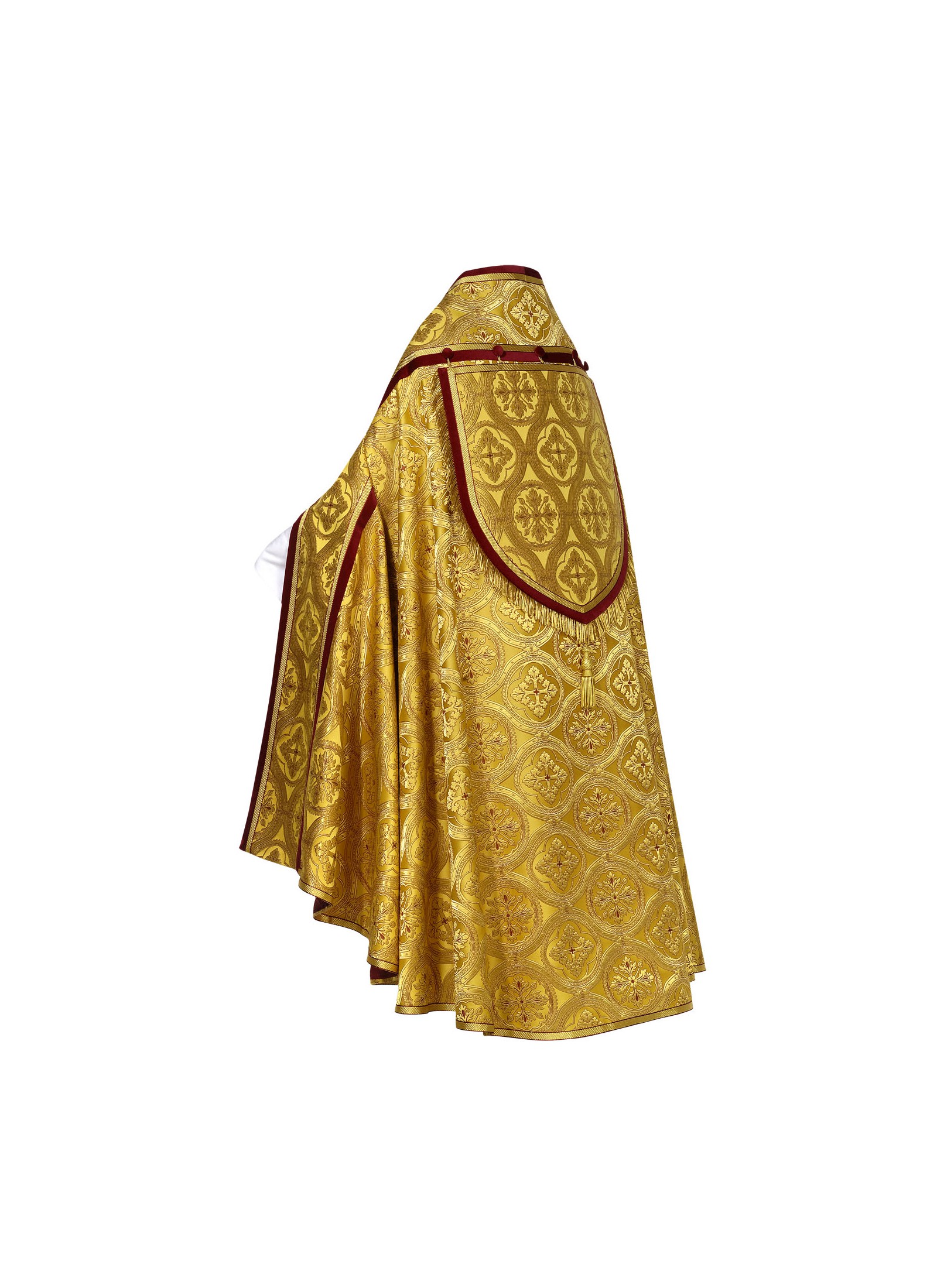 Traditionelle gotische Gewänder in einem exklusiven Goldbrokat, mit Samt und Goldgalone kombiniert.