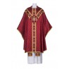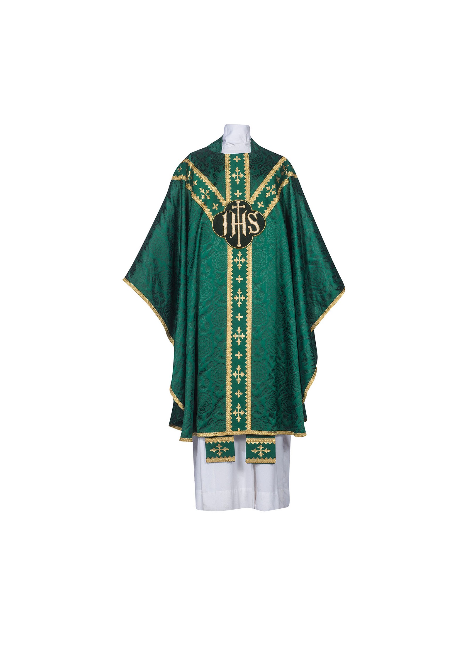 This collection is executed in Tudor Rose damask (a beautiful, lightweight damask) with embroidered JHS monogram and with gold galloon banding around the woven orphreys.