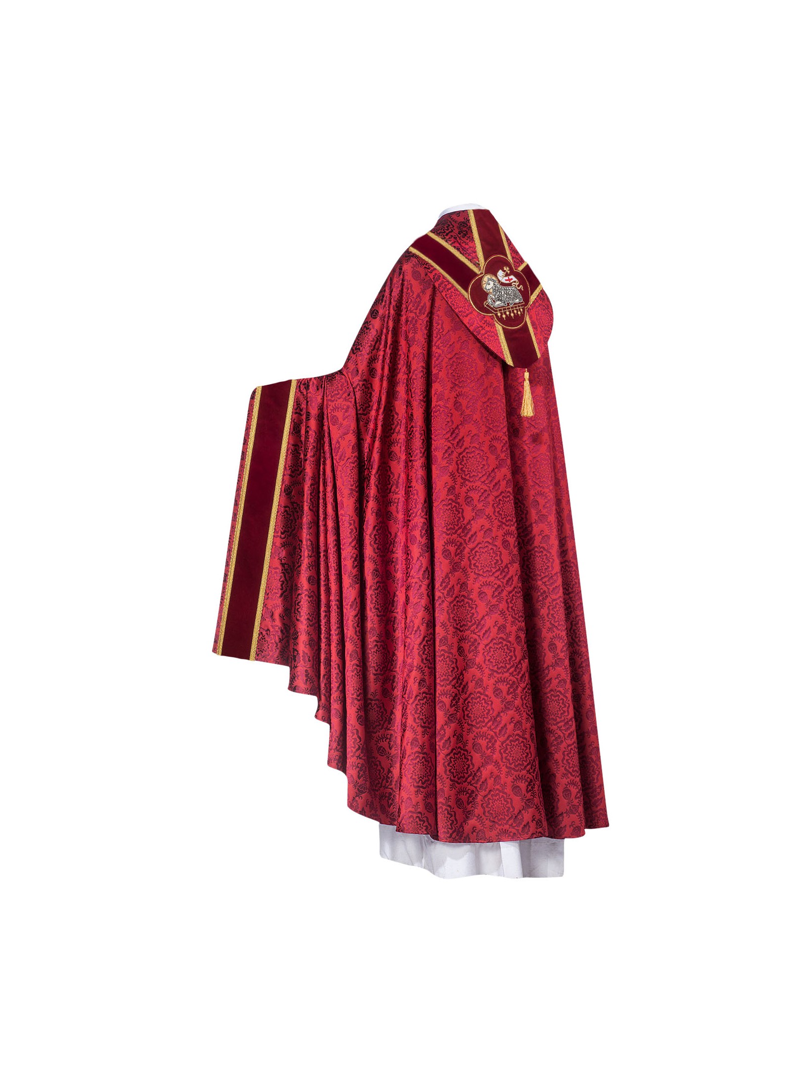This collection is executed in Tudor Rose damask. (a beautiful, lightweight damask) with embroidered Lamb Of God monogram in velvet orphreys.