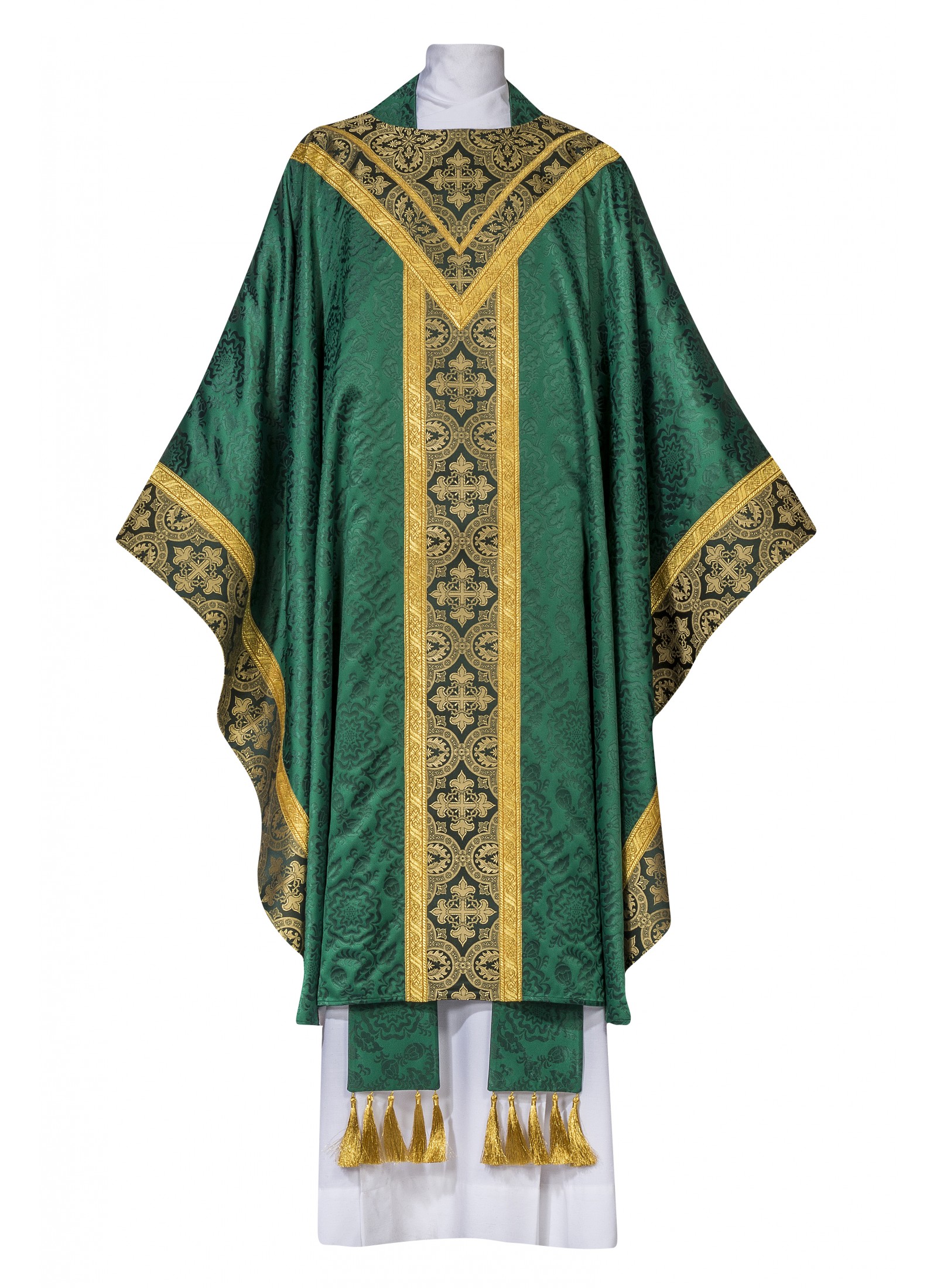 This collection is executed in Tudor Rose damask (a beautiful, lightweight damask) with an orphrey in Saxony brocade. These vestments are available in white-gold, white-burgundy, forest green, black-purple, rose-purple, purple, serum and red. The chasubles have an ample gothic cut with a 61” width and 49” length and include an inner stole.