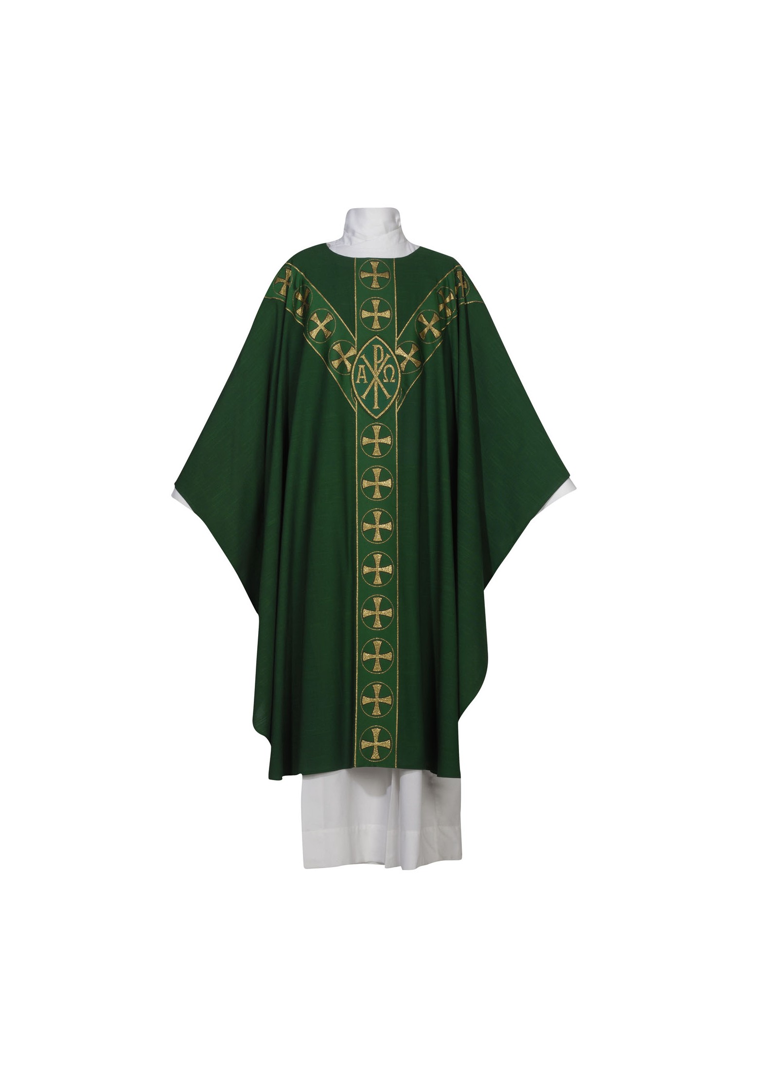 The chasubles have an ample gothic cut with a 61 inch width and a 53 inch length and include an inner stole.