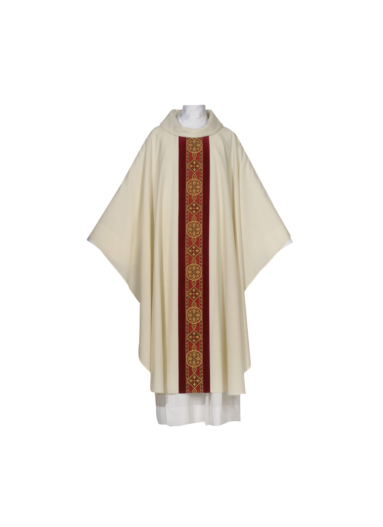 The chasubles have an ample gothic cut with a 61 inch width and a 53 inch length and include an inner stole
