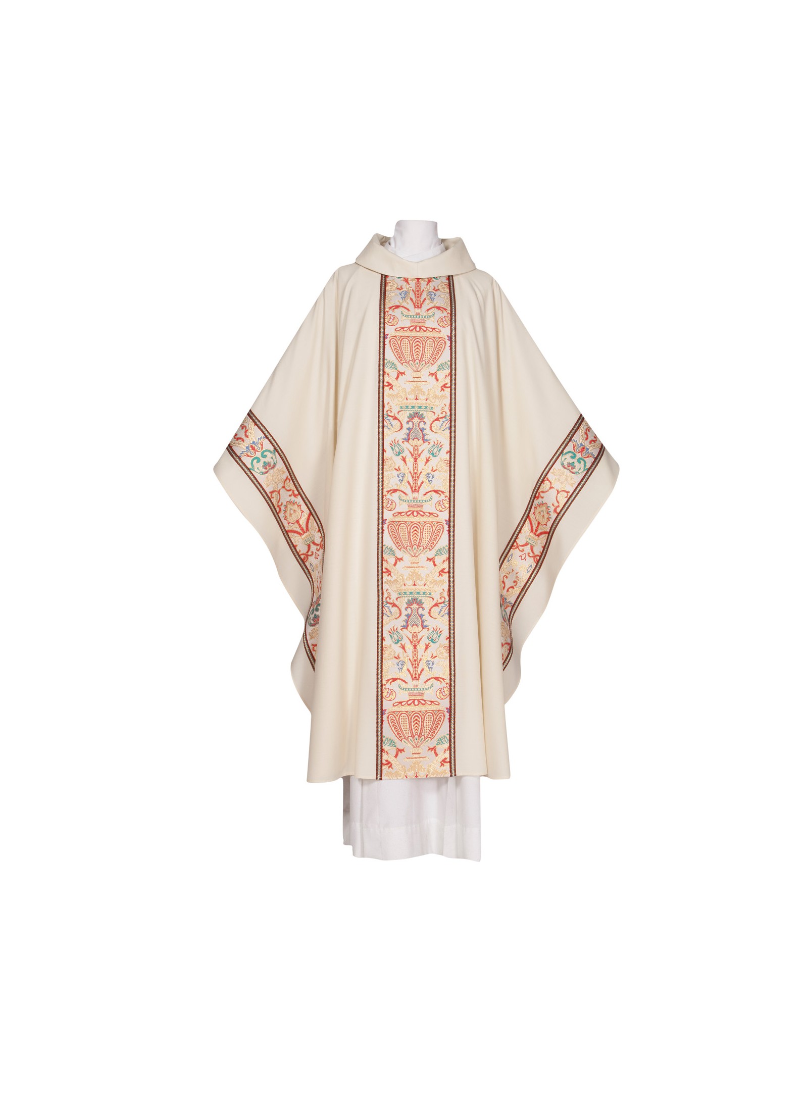 The chasubles have an ample gothic cut with a 61 inch width and a 53 inch length and include an inner stole..