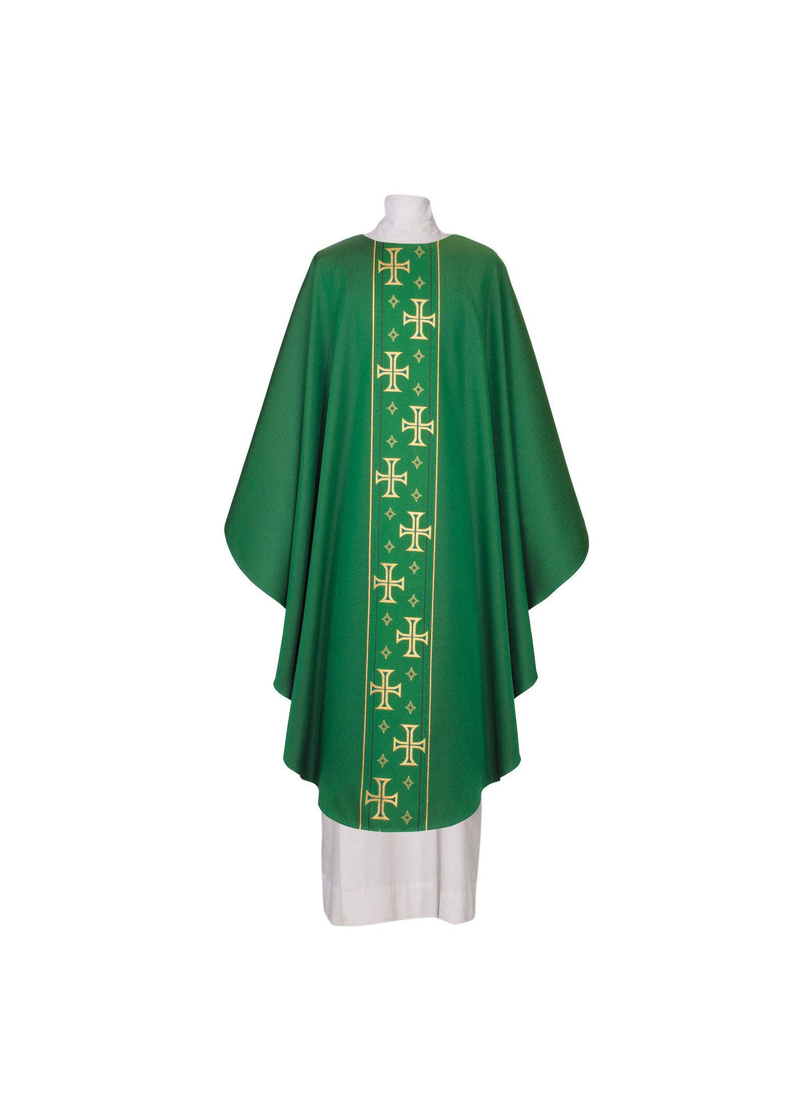 Made with a 98% polyester, 1% acetate, 1% metal. Executed in a lightweight breathable poly-weave. The chasubles have an gothic cut with a 61" width and 51" length and include an inner stole.