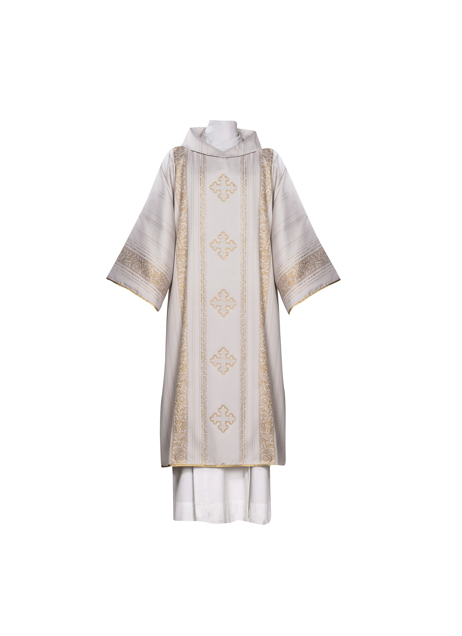 74% Polyester, 20% Acetate, 6% polyamide. These vestments are woven in a lightweight poly-weave and come in gold, white, red, green and purple. The chasubles have a gothic cut with a 61" width and 51" length and include an inner stole.
