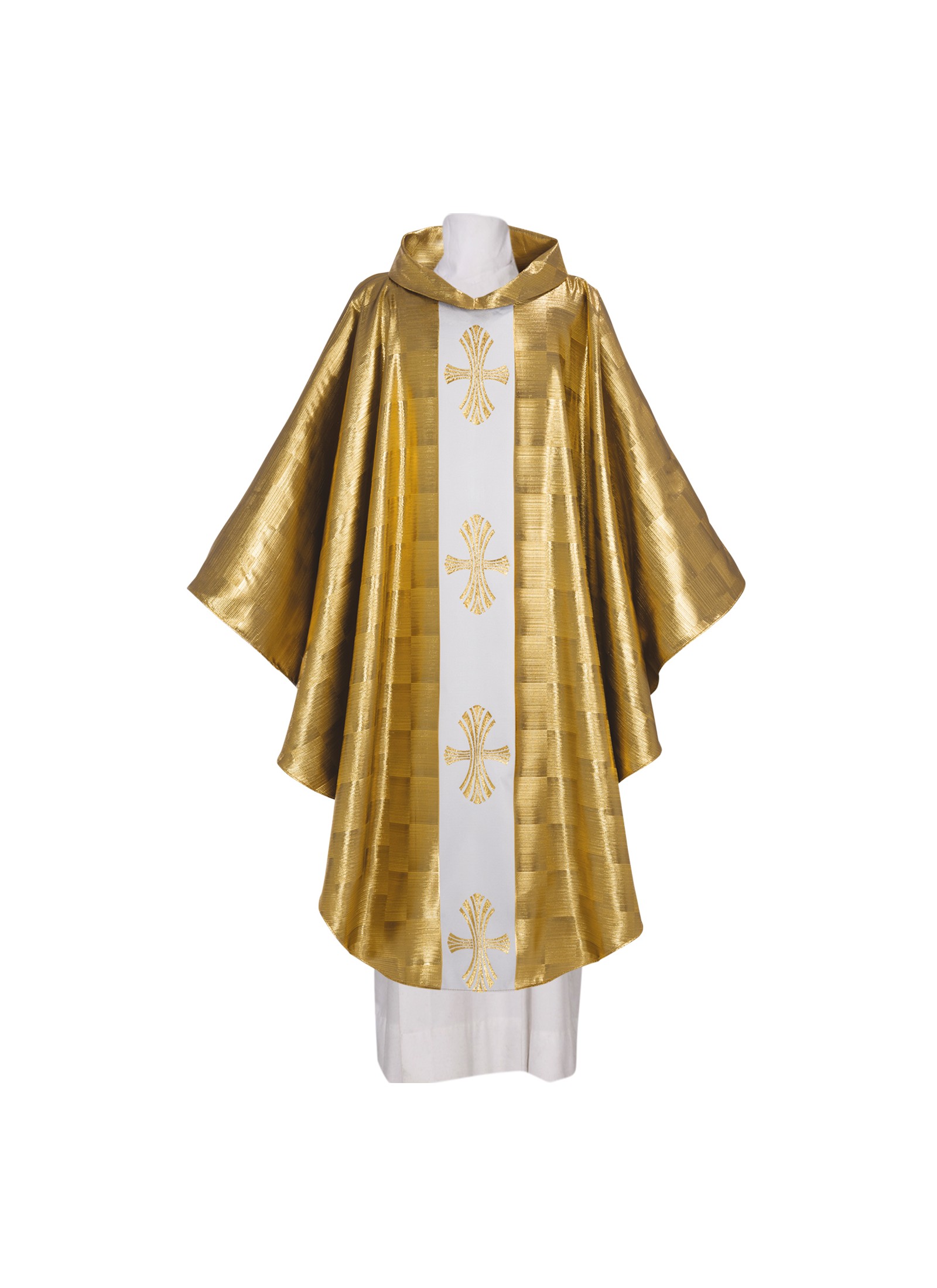 Festive vestments in a poly-weave, available only in white-gold execution. The chasubles have a gothic cut with a 61" width and 51" length and include an inner stole.