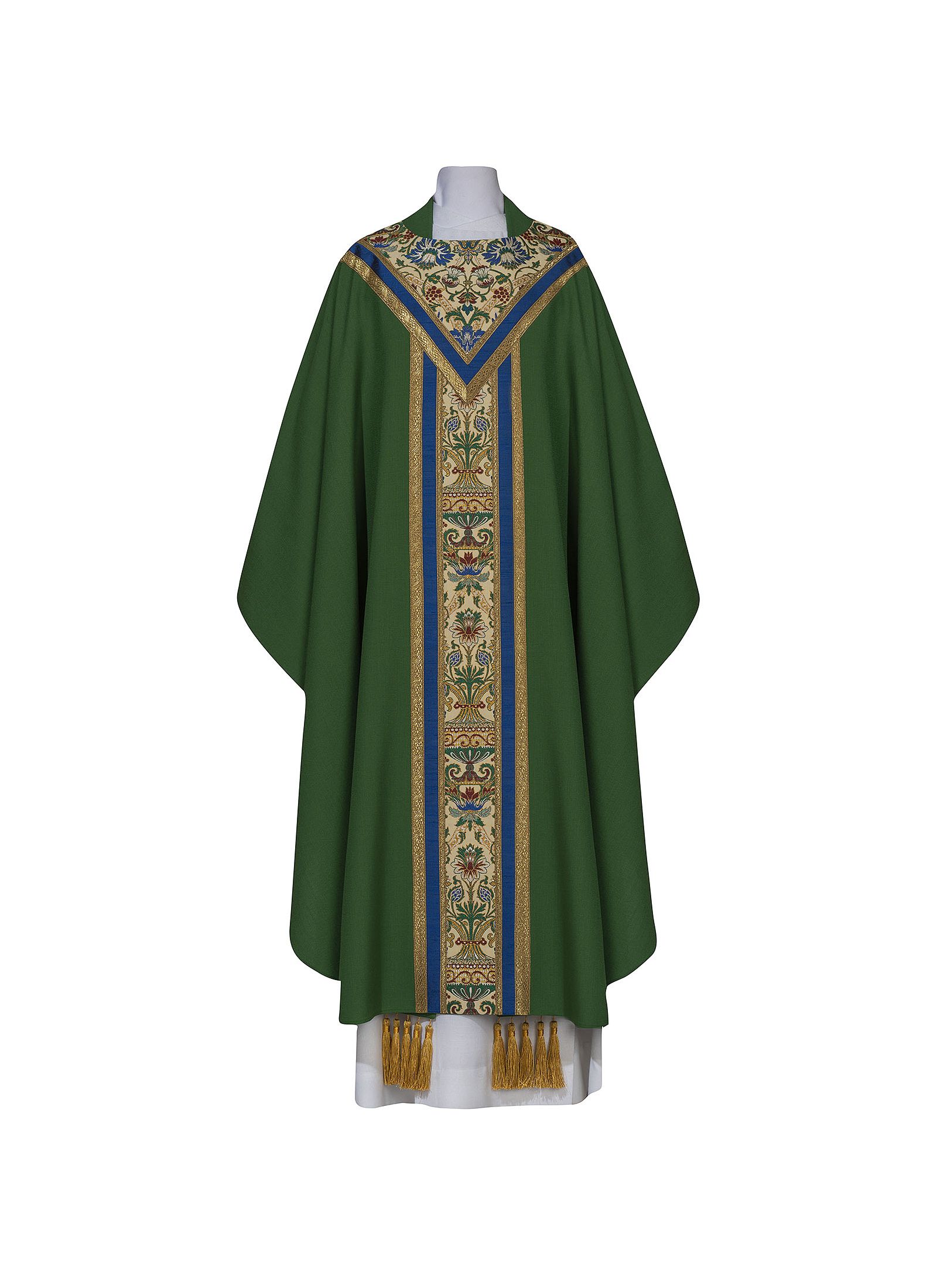The chasubles have an ample gothic cut with a