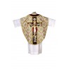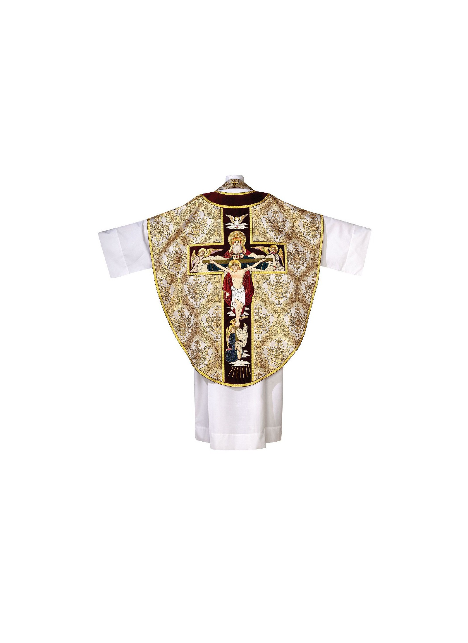 "God the Father" gothic vestment, made in an exclusive historical brocade with an authentic design, originating from the end of the 19th century, exquisitely and fully hand-embroidered on a burgundy velvet orphrey. The chasuble is lined and has a gothic cut with a 55 inch width and 47 inch length and includes an inner stole, burse and veil.