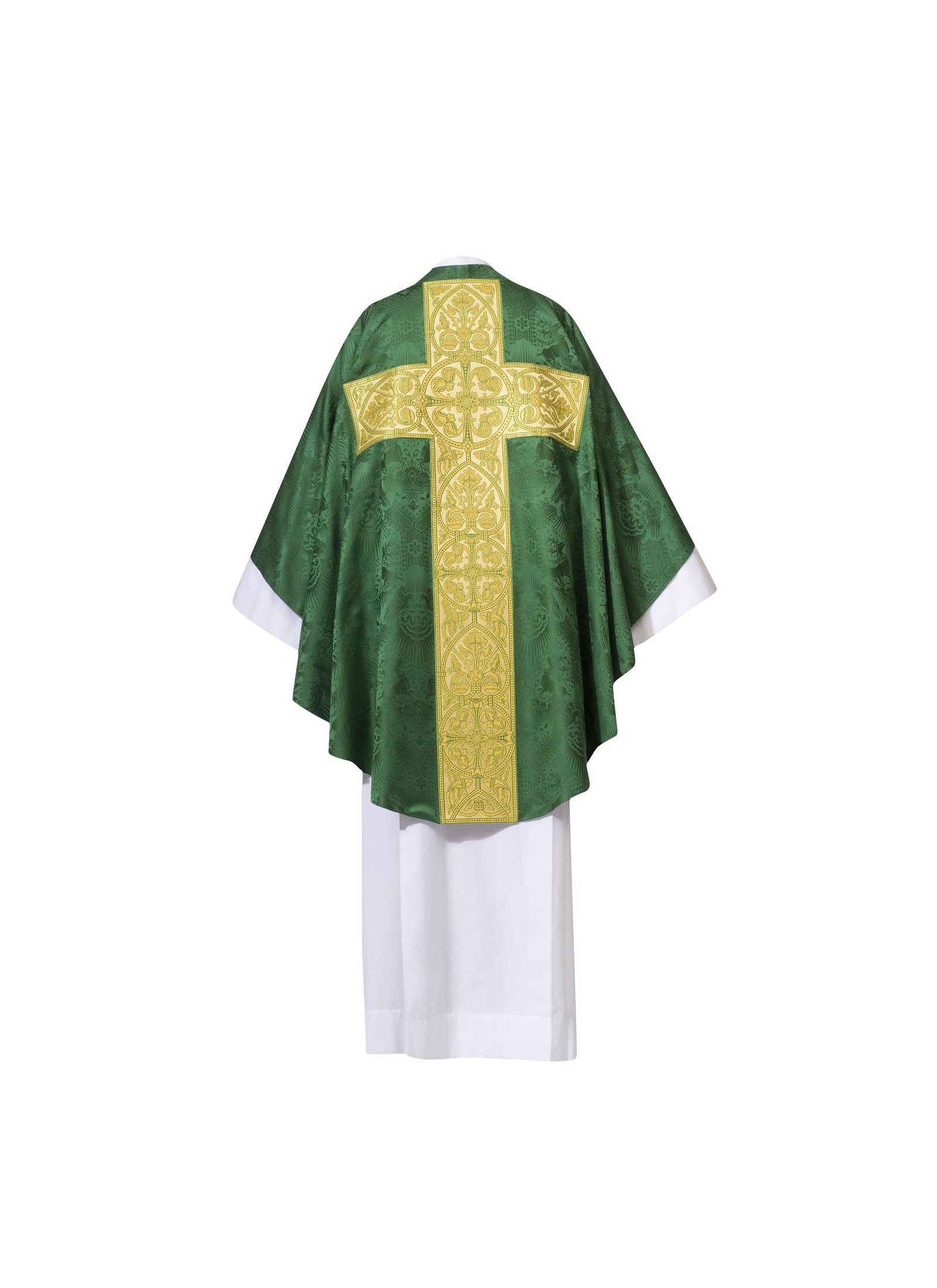 Beginning with an exclusive, polished-wool damask, the "Roman Cross" brocade appliqué is beautifully woven in Japanese gold with a design originating from the end of the 19th century. This is a true gothic cut of 55" width and 47" in length. The chasubles are lined and include an inner stole, a burse and a veil.