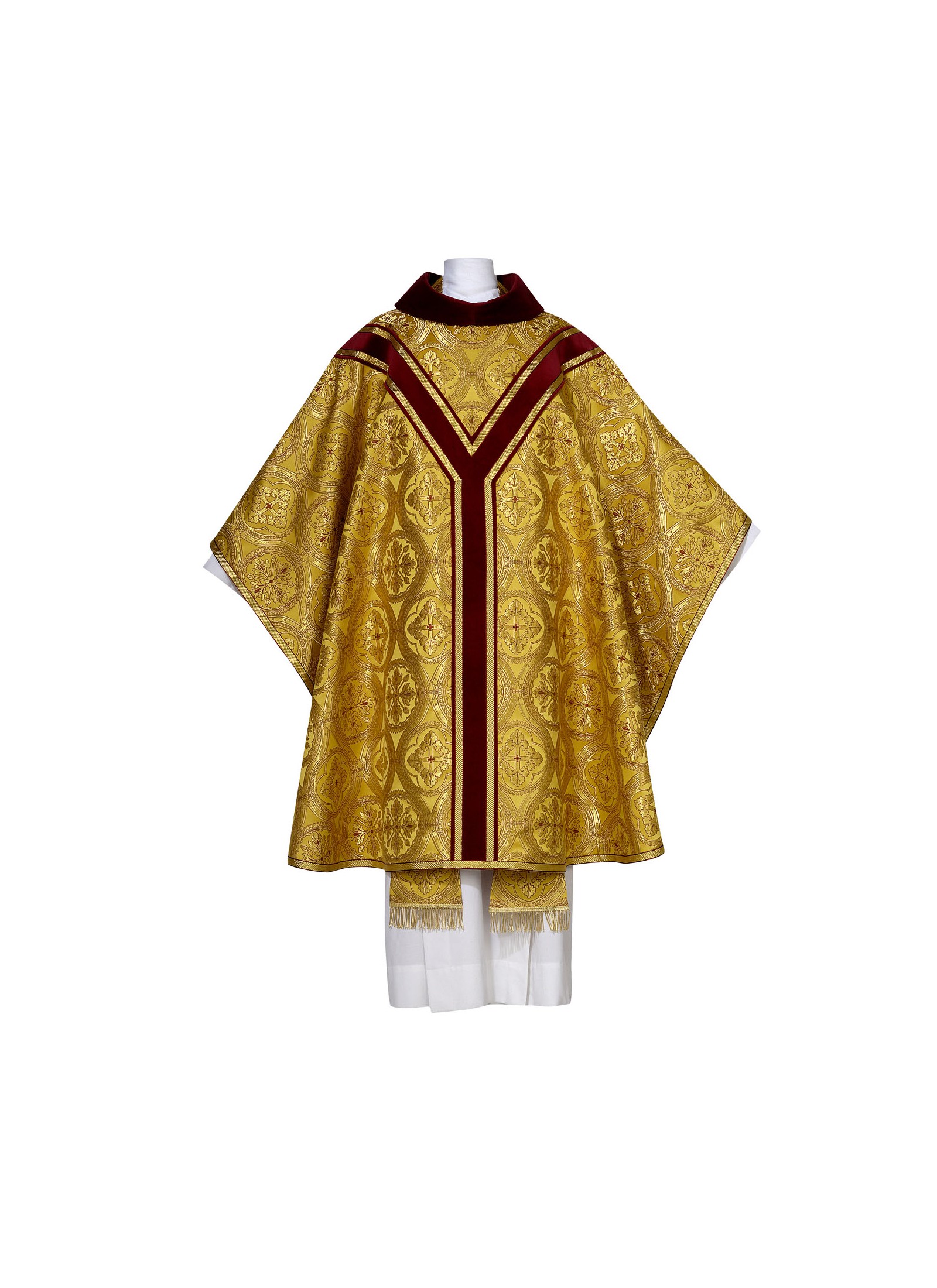 The chasubles are lined and have a gothic cut with a 61 inch width and a 49 inch length, and include an inner stole.