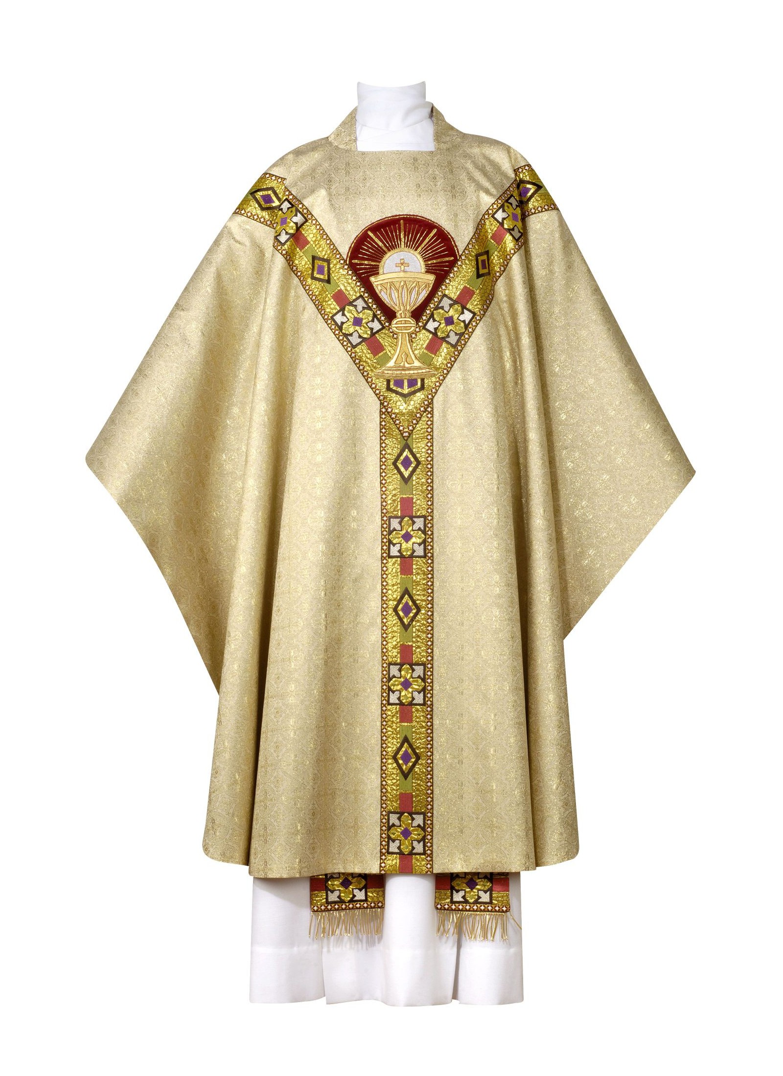 Chasubles traditionelles gothiques en brocart avec 'Calice' brodé à la main sur velours Bordeaux.
