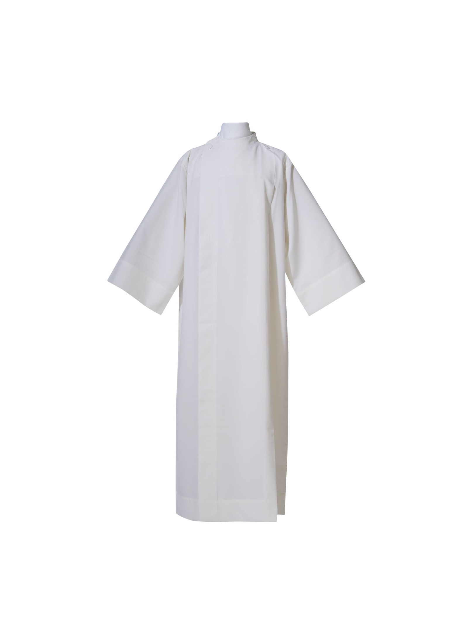 Snit 10: Manelvorm; halsopening met vaste amict; sluiting met 2 knopen bovenaan; twee plooien voor- en achteraan; zijplitten naar broekzak.