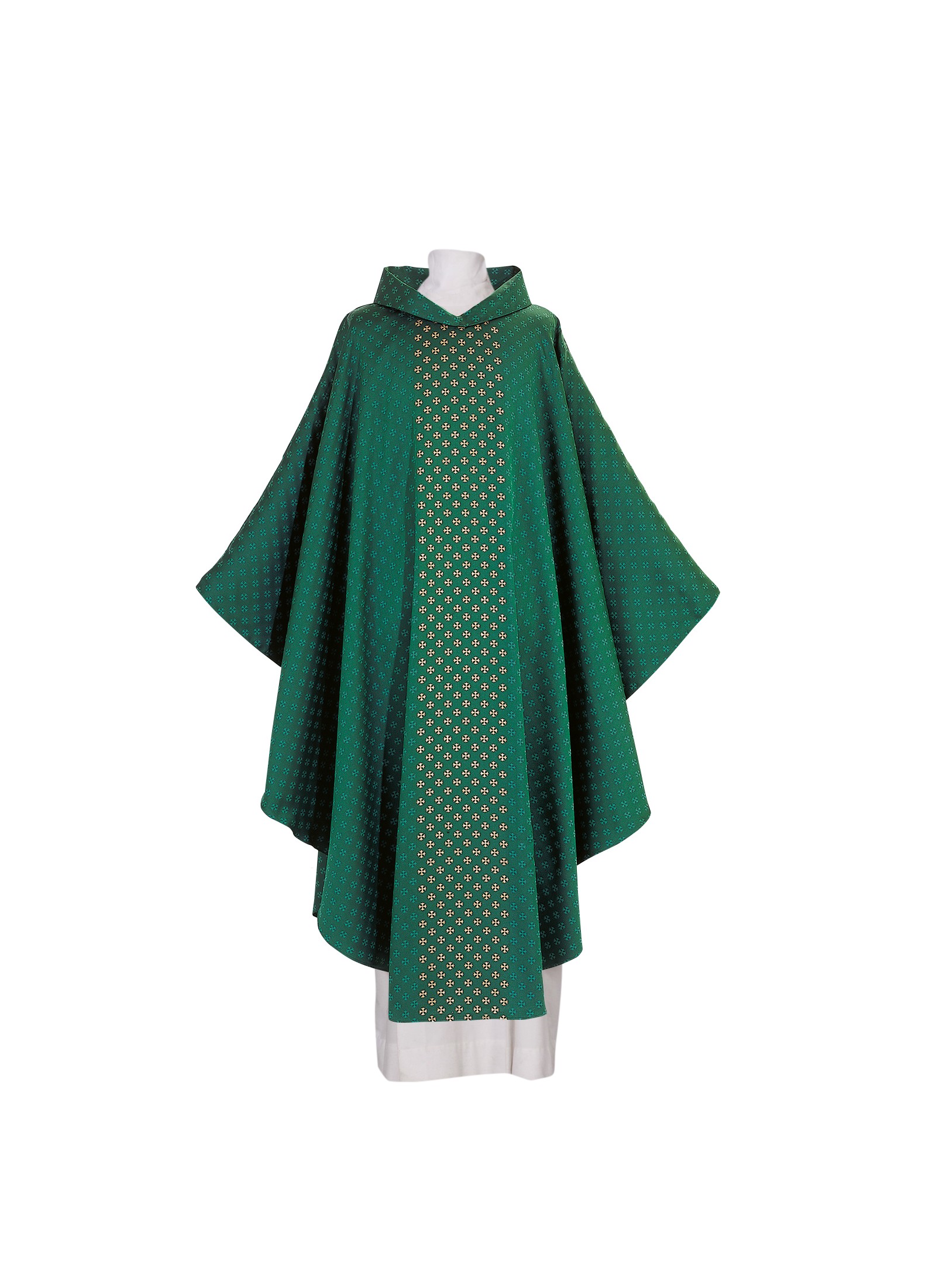 Deze kazuifels zijn gemaakt uit 97% polyester, 2% acetaat en 1% lurex. Ze hebben ingeweven kruisjes centraal op de voorkant en op de achterkant. Kazuifel: Breedte 155 cm, lengte 135 cm: met kazuifelstola.