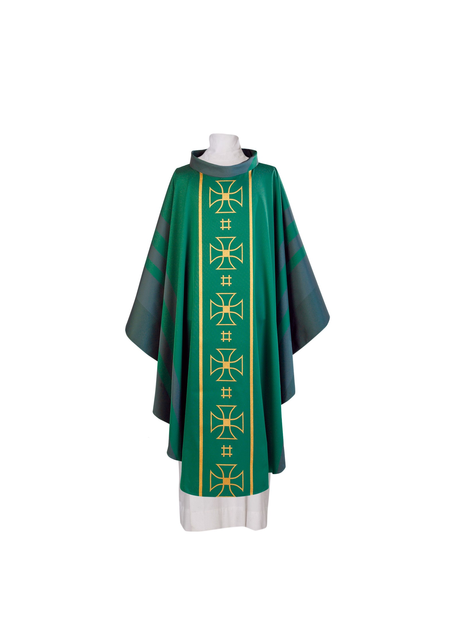 Deze kazuifels zijn geweven. Ze zijn gemaakt uit 96% polyester, 2% acetaat en 2% gouddraad. Kazuifel: breedte 155 cm, lengte 135 cm; met kazuifelstola